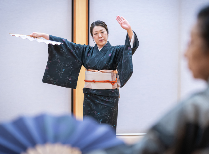 長唄の調べに合わせて、着物の袖がふわりと揺れる。凜とした美しさを感じさせるその所作は、足さばき、指先の角度、視線の送り方まで意識が向けられている。